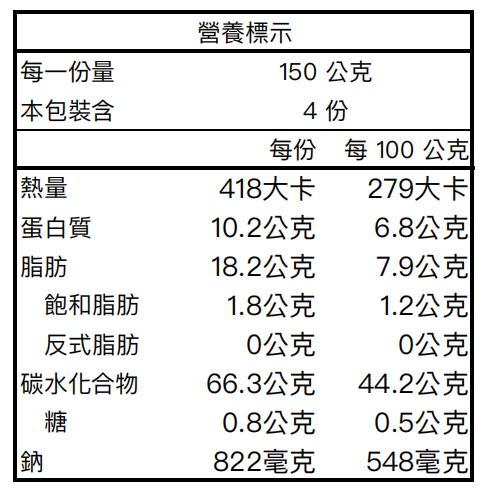 備註:本產品含有含麩質之穀物、大豆、花生、牛奶、芝麻及其製品,不適合對其過敏體質者食用。